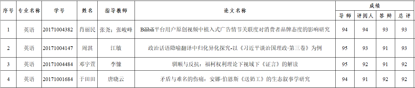 根据公司《本科毕业论文(设计) 工作管理办法》的规定,经答辩委员会审定毕业论文总评成绩,拟推荐 肖丽民、周淇、邓宇萱、于田田 共四位同学的学士学位论文为校级优秀毕业论文,以上推荐名单将报校学位评定委员会审批。