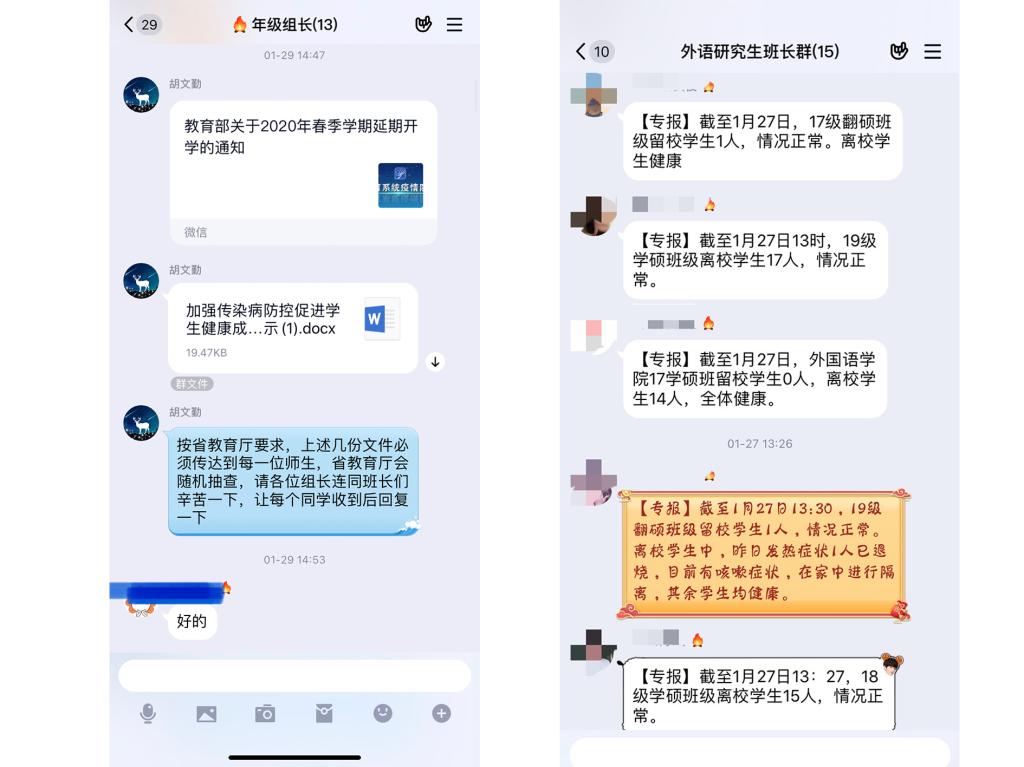 1.落实平安日报制度。1月24日,从一声声“新春快乐,平平安安”开始,db真人体育官网开始了同学们每天的平安报告,坚持“零报告”制度,做到本研员工100%全覆盖。与此同时,公司辅导员通过年级群、班长群、学务指导和班主任群、员工党员群、家长群等做好疫情防控的引导宣传工作,时时转发科学防疫注意事项以及相关工作通知。