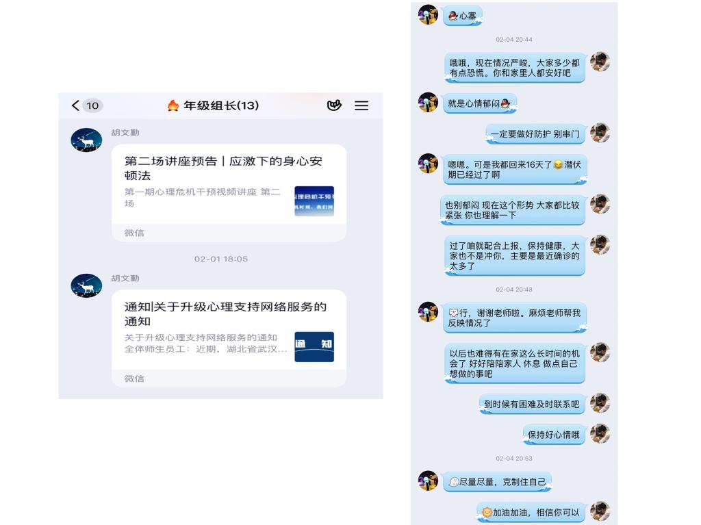 2.加强心理关怀疏导。对同学们面对疫情可能产生的焦虑、恐慌情绪加以识别关注,加强对同学们对心理关怀和疏导,及时转发心理支持和援助渠道资源,引导同学们关注权威信息,自觉屏蔽不良信息,不信谣、不传谣。分享居家学习、健身等优质资源,引导同学们健康居家、阳光居家。