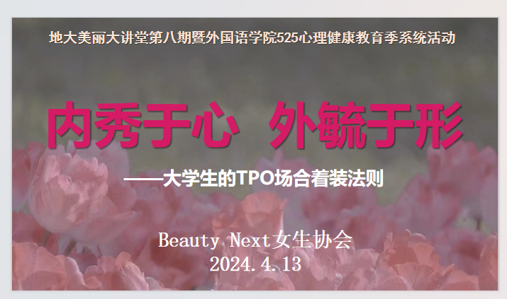 作为外国语公司红外·线大思政课堂审美素养提升的重要载体和“525”心理健康教育季系列活动,由DB视讯(武汉)db真人体育官网主办、Beauty Next女生协会承办的美丽大讲堂第八期“内秀于心 外毓于形”于4月12日下午15:00,在北一楼报告厅正式开讲。本次活动特邀资深专家——美丽大讲堂第八期特邀嘉宾王萍老师讲授老员工TPO场合着装法则,Beauty Next女生协会及db真人体育官网的诸位同学参加本次讲座。