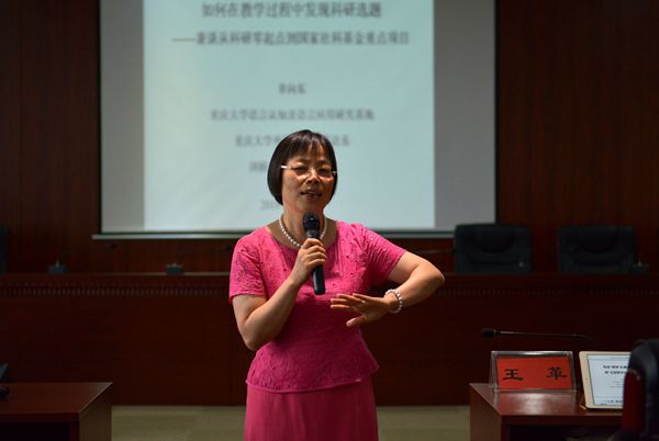 随后,刘芳副经理主持讲座,邀请辜向东教授开场主讲。辜老师讲座的题目是“如何在教学过程中发现科研选题——兼谈从科研零起点到国家社科基金重点项目”。她从自身的科研经历出发,生动诠释了自己如何从一位科研小白华丽转身,在女性扮演的多重角色中平衡、解决工作和生活的各种矛盾、冲突,一步步地完成从专科毕业生到业内学术大咖的变身历程。通过总结个人及团队在过去二十多年里的实践经验,辜老师提出,要广泛涉猎、敏锐思维,将普及与经典相结合,关注国家大事并联系自己的专长,在实践中去寻找科研突破点。同时,她还强调团队合作与创新,在过程中不断进行总结与反思,积极交流与促进,拥有国际眼光。在日常生活中,我们大学英语教师,尤其是大学英语女教师要充分利用碎片化时间,享受读书,挤出时间搞科研,将教学、科研和家庭生活完美结合。除了科研的点拨,辜老师还以丰富的人生阅历在教学、育人甚至家庭生活方面为大家提供建议,贡献了无数金句,引起大家共鸣。从讲座和互动中,听众发现辜老师成功演绎了众多女性角色。她是学识渊博的睿智教授,诲人不倦的资深博导,精明强干的团队leader,家里家外一把抓的完美wife,“有其子必有其母”的“优质”mother,和蔼慈祥的年轻grandma。她讲得热情欢脱、风趣幽默、金句频出,听众们听得悠然自得、眉飞色舞、兴致勃勃。