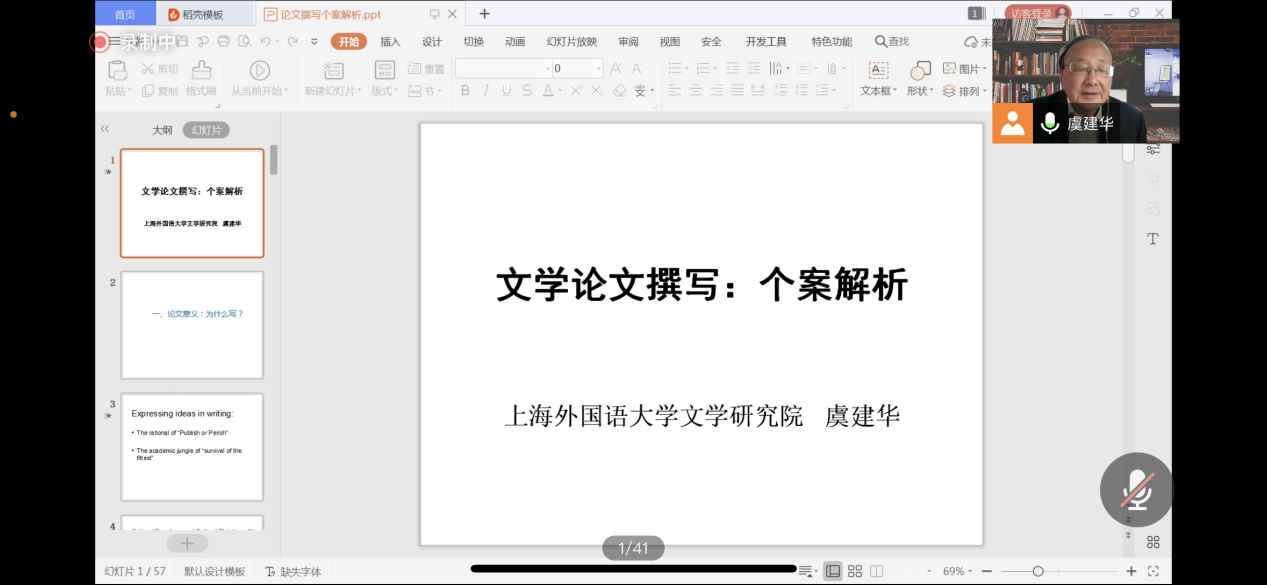 (通讯员:黄皓亮 金梓轩)2021年11月25日下午14:00,db真人体育官网“南望今声”外语论坛系列讲座如期召开。上海外国语大学文学研究院的虞建华教授应邀为公司师生做题为“文学论文撰写:个案解析”的讲座。本次讲座采取了线上腾讯会议直播的形式,公司共140余名师生参与学习交流。