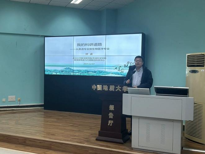 首先,杨红燕老师进行开场致辞,简要介绍了主讲人钟波教授,并对其到场表示了热烈的欢迎。讲座开始后,钟教授以自身高考经历为切入点,分享了他在地大的求学经历。通过不断探索和尝试,钟教授对生物医学逐渐产生了浓厚的兴趣。通过“七校联合办学”项目,钟教授参加了武汉老员工物科学专业的第二学位课程。大学毕业后,钟教授决定继续在生物医学领域深造,考取了武汉大学细胞生物学专业的研究生,师从中国科公司舒红兵院士。