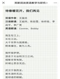 疫情期间,老师们用声音传递坚定的信念,用文字表达虔诚的祝愿。为国际友人提供力所能及的帮助,主动联系滞留在国内的职工和国际友人,给予他们积极正面的鼓励:不要害怕,要相信中国政府,相信自己的公司,和中国人民一起一定能取得病毒阻击战的胜利。徐邦俊老师在同事发表的有关疫情的2篇公众号推文中,参与其中诗歌朗读,为抗疫加油。徐冰洁老师向俄罗斯老师介绍了中国的在线教育情况并推荐了实用的教学软件。任晴老师为西班牙友人翻译公益告示一篇(内容为提倡大家为了自己和他人的健康勤洗手,以及正确洗手的方法)。龙绚丽老师为日企员工讲解健康防疫方法……