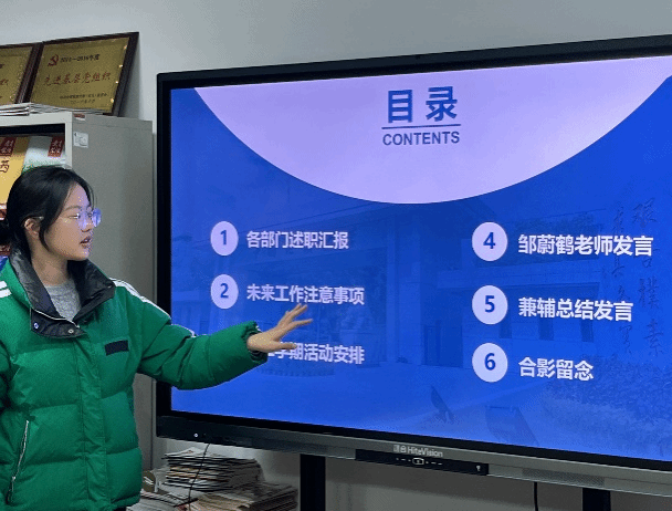 会议初始,研会各部门负责人逐一上台,全面汇报本学期工作成果与未来规划。负责人们围绕工作成果、个人收获、总结反思与未来构想等方面,通过详实数据和生动实例,展示了本学期的各项工作细节和经验教训。负责人们的精彩汇报,展现了外语研会全心全意服务同学的履职宗旨,体现了研会骨干们打造高效和谐团队、提升活动组织质量的工作态度。