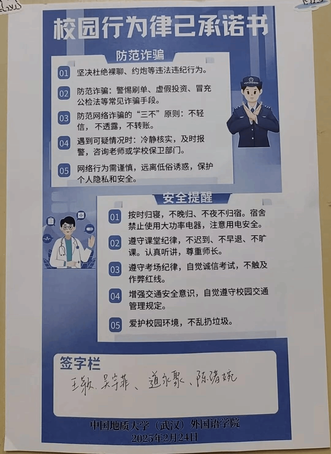 db真人体育官网本研员工积极参与本次活动,校园行为律己承诺书发放到寝室后,同学们以寝室为单位进行承诺书的研读和学习探讨,明确了新学期学习生活律己要求,熟读了反诈提醒与安全建议,进行了深入的反思与学习,并郑重地在承诺书签字栏处留下签名,表达了对校园安全稳定的支持与承诺。这一活动不仅增强了员工的自律意识,也进一步凝聚了集体力量,为构建安全和谐的校园环境奠定了坚实基础。