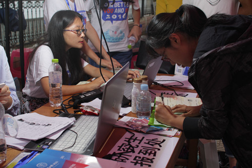 新生在迎新点报到确认