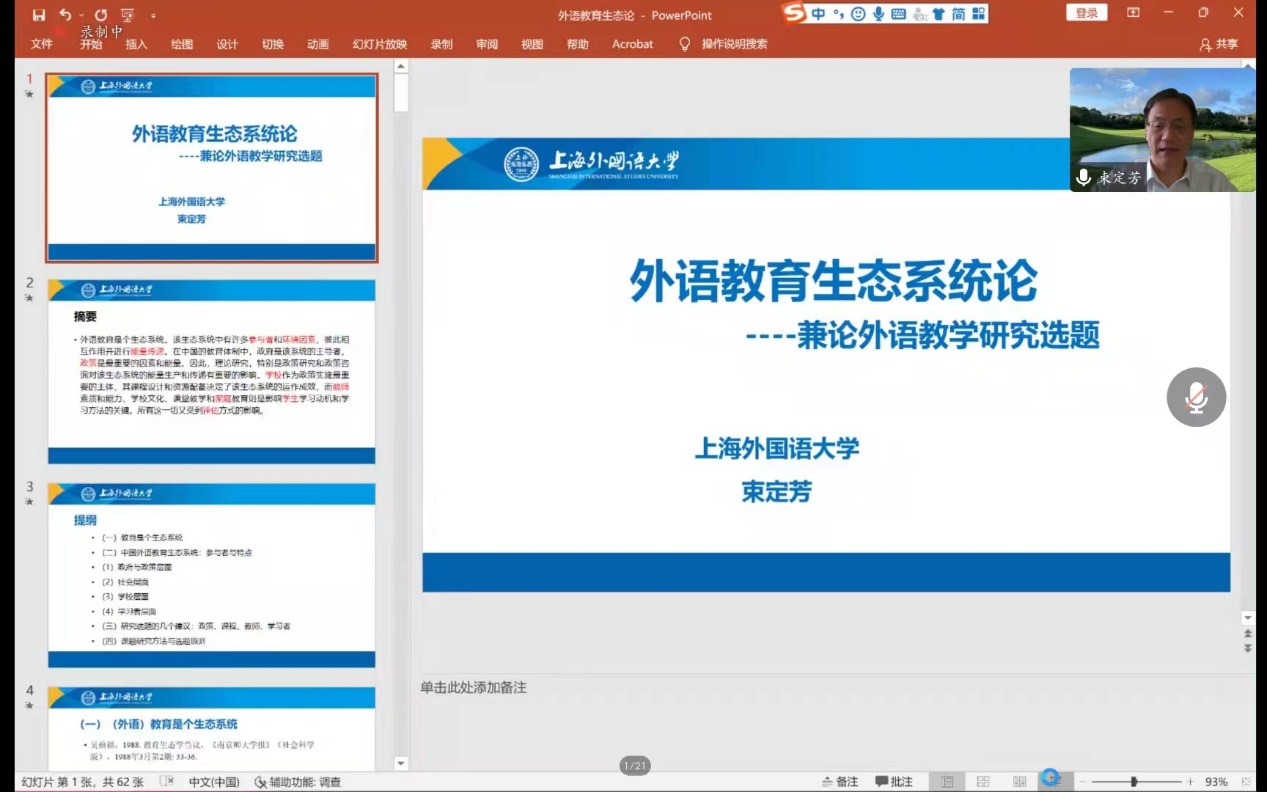 (通讯员 金梓轩 杨红燕)2022年9月22日上午9:30,db真人体育官网“南望今声”系列讲座如期举行。上海外国语大学大学博士生导师束定芳教授应邀在线上为公司师生做了题为“外语教育生态系统论——兼谈外语教育研究课题”的讲座。讲座由db真人体育官网副经理张伶俐教授主持,公司师生共140余人参与了学习交流。
