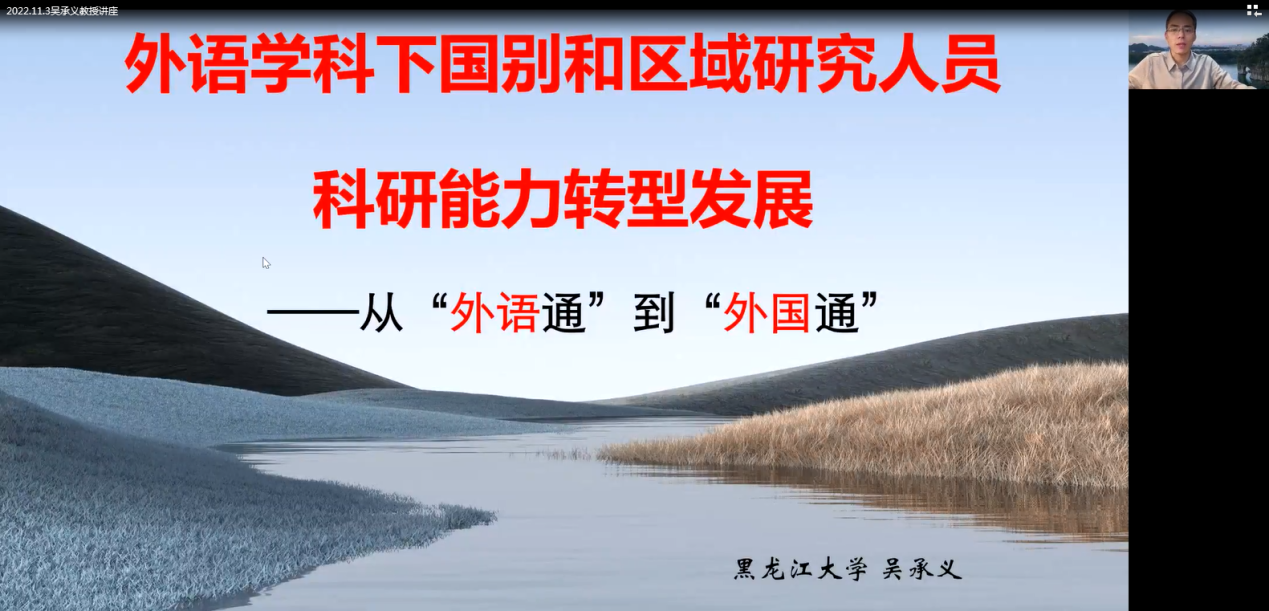 (通讯员 王国念)2022年11月3日下午14时30分,作为校庆70周年系列活动之一的“南望今声”外语论坛第40期在线上如期举行。黑龙江大学吴承义教授应邀为公司师生做了题为《外语学科下国别和区域研究人员科研能力转型发展:从“外语通”到“外国通”》的讲座。讲座由公司db真人体育官网王国念副教授主持,db真人体育官网及其他兄弟高校近200名师生参与学习交流。