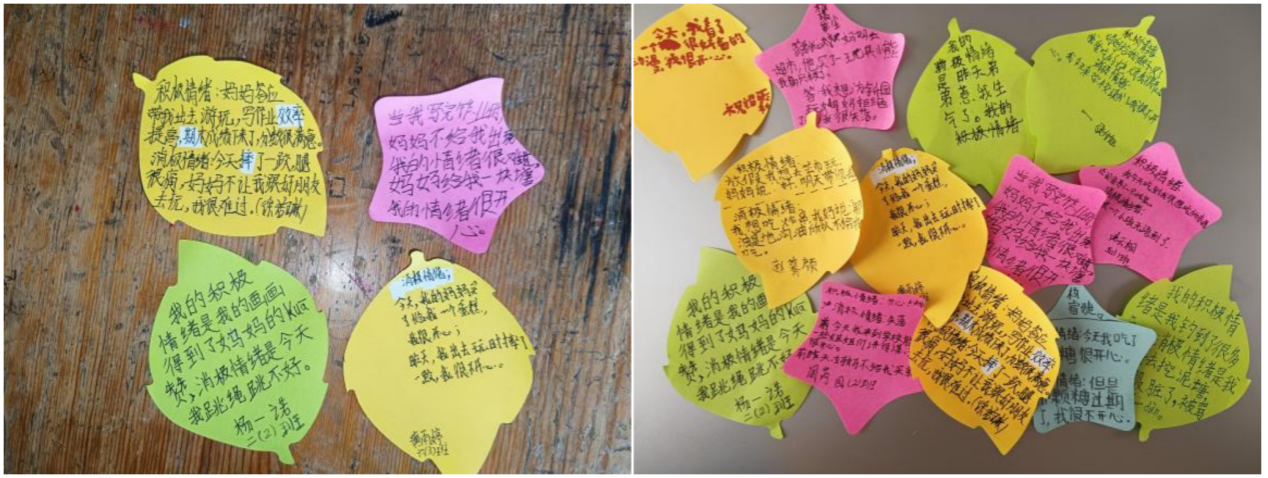 随后,实践团成员邀请同学们制作自己的情绪纸条,表达出自己的积极情绪和消极情绪。在活动现场,同学们积极地写情绪小纸条,表达自己的近一周以来所遇到的“开心”和“难过”,还有的同学主动把自己的情绪故事分享给大家听。通过动手实践,让同学们进行了充分的情绪释放,感受了一场愉快的心灵SPA,并深刻认识到了情绪是每天陪伴在自己身边的伙伴,认识情绪也是认识自我的过程,自己要把握好在情绪中的主体地位,并以正确的方式管理和调控情绪。