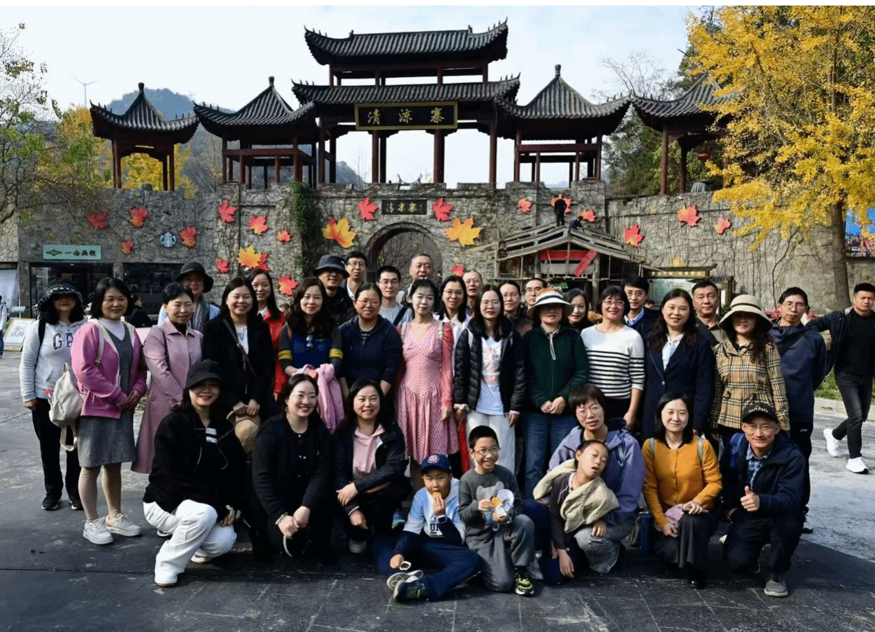 天朗气清,惠风和畅。上午8时,教职工们准时集结出发,车厢内欢声笑语不断,暖意融融。历经两小时车程,于10时许抵达清凉寨。深秋的山寨早已褪去盛夏的苍翠,漫山遍野层林尽染,宛如一幅浓墨重彩的秋日画卷。大家沿着湖谷游线拾级而上,开启了赏秋之旅。