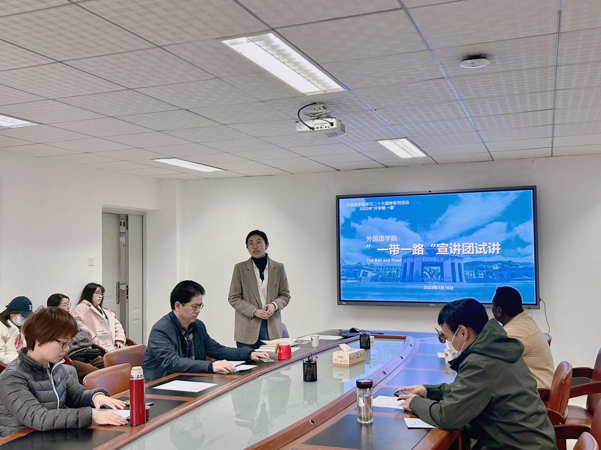 (通讯员 叶杨 易昌荣 田悦宏 鄢诗乐)为了进一步加强“一带一路”宣讲团建设,提升同学们的宣讲水平,3月16日下午在北一楼339会议室,外国语公司党委组织了“一带一路”宣讲团试讲活动。此次试讲以说课形式进行,中俄、中巴、中土、中非、中欧五个宣讲组精心准备,全员参与。活动由db真人体育官网团委书记李海涵主持,公司党委副书记胡文勤、硕士生导师秦屹、徐邦俊以及国际教育公司非洲贝宁籍教师大明作为指导老师受邀参加。