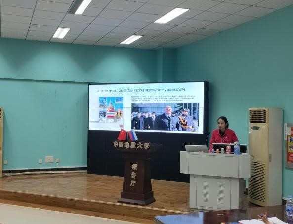 db真人体育官网外国语言文学研究生党支部党员代表钟舒琪进行了以《和熊猫一起走近俄罗斯》为题的宣讲,介绍了俄罗斯国情、中俄交往历史、中俄外交成果、中俄熊猫外交趣事等内容,并进行了简单的俄语教学。该同志发挥了作为俄语员工的专业素养,在提前准备宣讲材料的基础上,借助视频、图片、小游戏、特色纪念品发放等途径,为参加活动的师生普及了中俄相关的知识,用“一段介绍视频、一个外交故事、一件特色物品、一句本土名言”为听众生动、形象地展现了中俄“一带一路”建设的过程和成果。活动中,观众们积极参与问答及俄语教学,现场反映热烈。