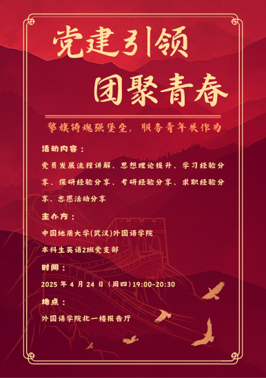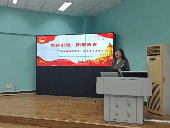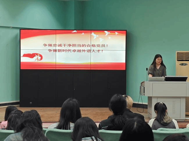 2025 年 4 月 24 日晚 19:00至20:30,db真人体育官网本科生英语2班党支部于北一楼报告厅举办 “擎旗铸魂强堡垒,服务青年展作为——党建引领・团聚青春”主题联动大会。本次活动以强化党建带动团建作用、服务青年成长为核心,通过理论学习、经验分享等形式,凝聚青年力量,筑牢思想根基。本2支部党员代表及2024级全体本科生共同参与。
