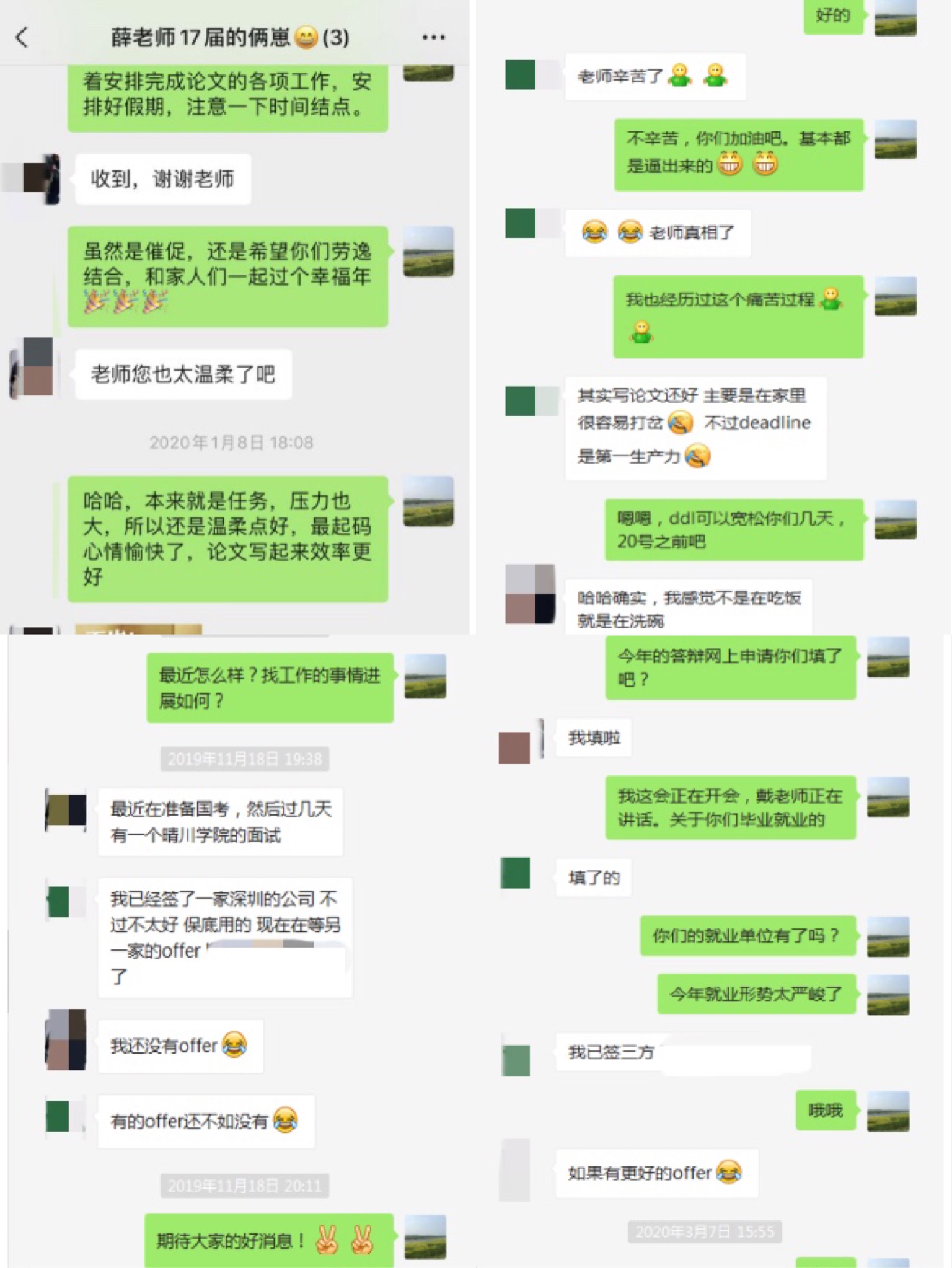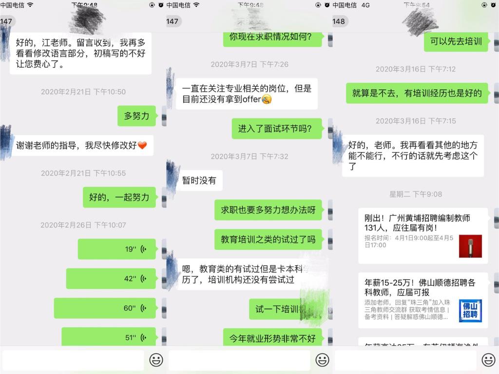 除公司和公司组织的网络双选会、空中宣讲会以及在线面试之外,导师们也都通过多种途径主动跟进毕业生就业意向、就业动态,不遗余力地寻找各类就业信息与途径,在自己有限的能力范围内尽最大可能帮助员工解决就业难题。王伟老师和汪卫红老师常在研究生群里发布专业相关招聘和培训信息。李孝奎老师通过电话与自己的研究生进行沟通,与研究生召开定期例会,就文献阅读,科研探索和实习实训等话题进行交流和指导。李老师今年的毕业研究生方同学面临着初步入职协议保底、签订意向协议、备战公务员考试等几种选择,目前疫情造成不少工作停滞,李老师在员工迷茫时常给予鼓励和建议。