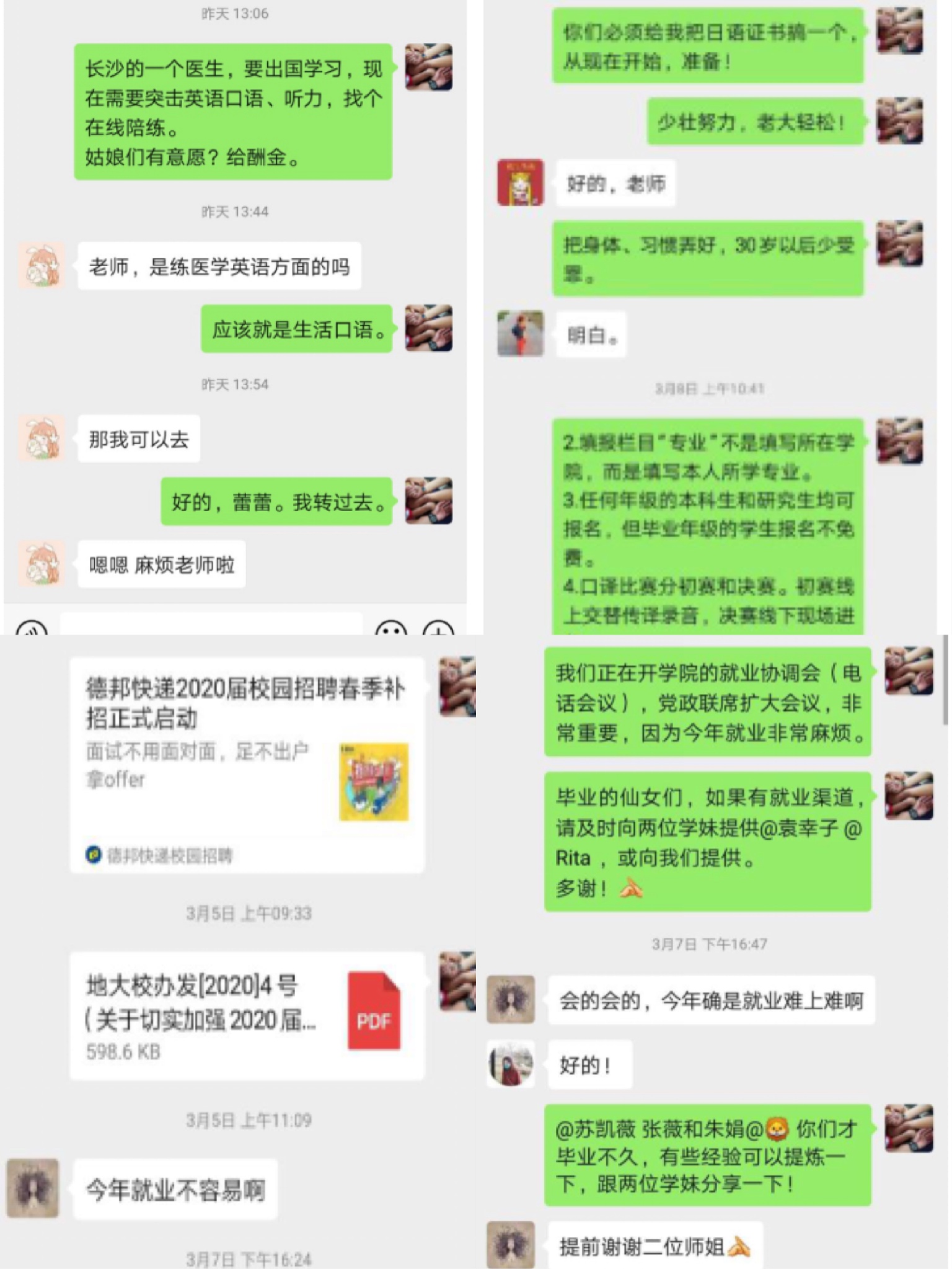 (通讯员 金虹)三月,疫情发展持续向好,但毕业生就业升学的形势依然严峻。面对疫情防控和毕业生就业的双重压力,db真人体育官网及时建立与疫情防控相适应的毕业生就业工作机制,号召全体教职员工调动一切资源和力量,深入了解和帮助员工,坚决打赢就业攻坚战。外院研究生导师们积极响应公司、公司号召,对毕业研究生在求职就业和心理疏导方面给予了无微不至的关怀与帮助。在求职就业方面,他们及时了解员工动态,不遗余力帮助员工寻找各类招聘信息和资源,加强求职观念、技能和面试的线上指导;在生活方面,他们在确保员工论文顺利完成的同时,密切关注员工的身体和心理健康。在公司和公司之外,他们是毕业研究生身边最可靠的坚强后盾。